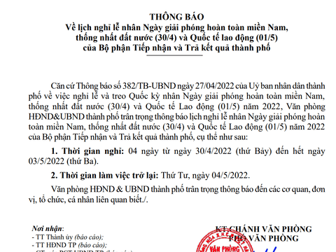 Thông báo về lịch nghỉ lễ nhân Ngày giải phóng hoàn toàn miền Nam, thống nhất đất nước (30/4) và Quốc tế lao động (01/5) của Bộ phận Tiếp nhận và Trả kết quả thành phố